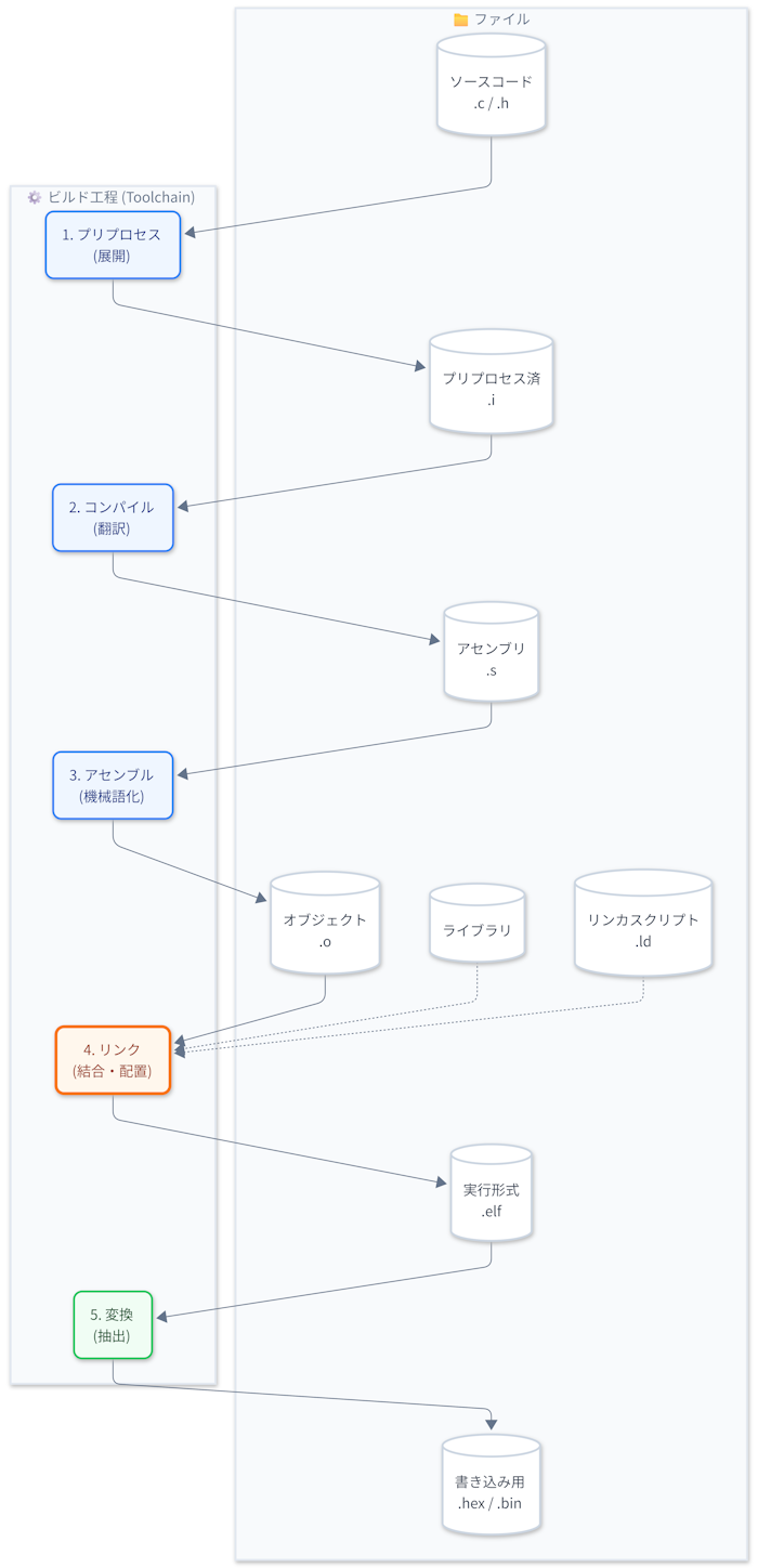 そのため、ソースコードを機械語に翻訳し、マイコンが実行できる形式にパッケージングする必要があります。この一連の変換工程を「ビルド」と呼びます。 大学1年生の授業で習ったような、習ってないような気がしますね。